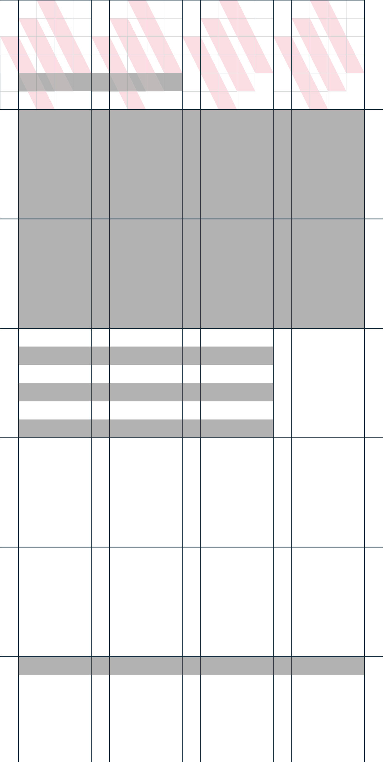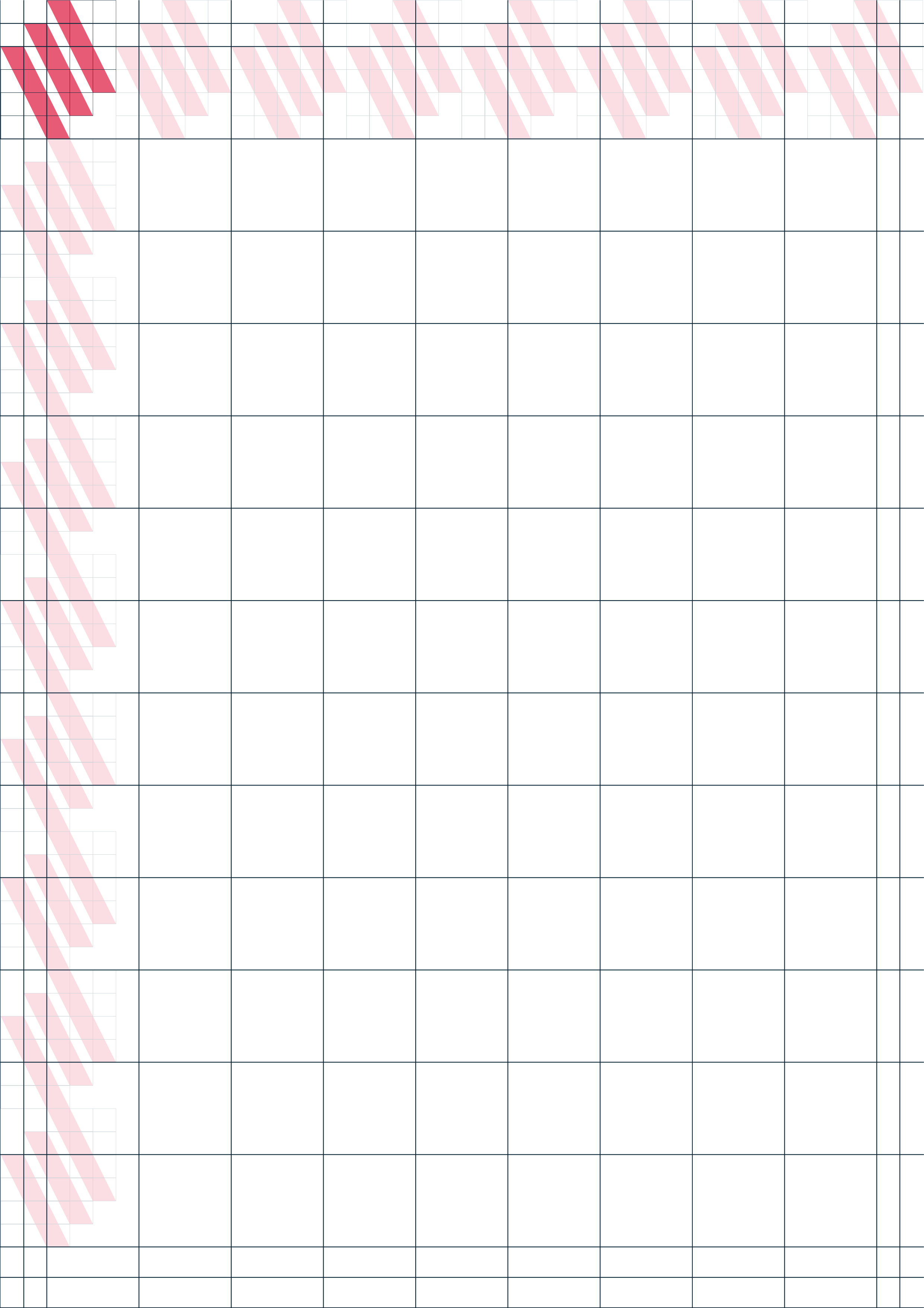 Tomamos como punto de inicio la retícula de un documento A4, sin duda alguna el formato más usado para la papelería y para impresión de documentos. Repitiendo el isotipo ocho veces de forma horizontal y 9 de forma vertical conseguimos una retícula de 40 por 56 cuadrados de la rejilla inferior (la usada para formar el isotipo). Lo que conseguimos de este modo es generar uno margen de 2 unidades y columnas y filas de 4 unidades. Sobre esta base se construye una rejilla de columnas con calles iguales a la interlínea usado para el texto corrido.